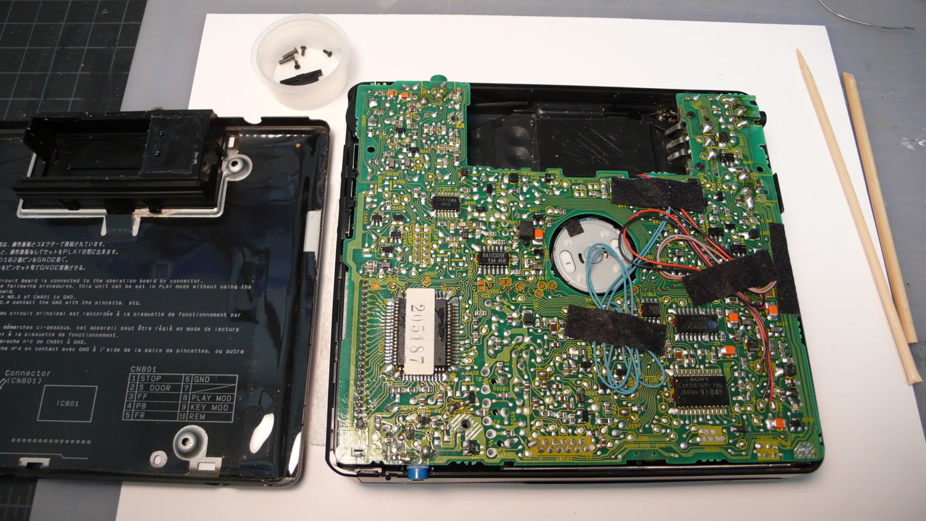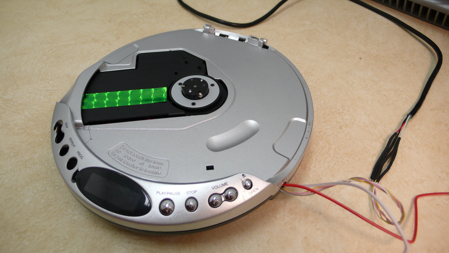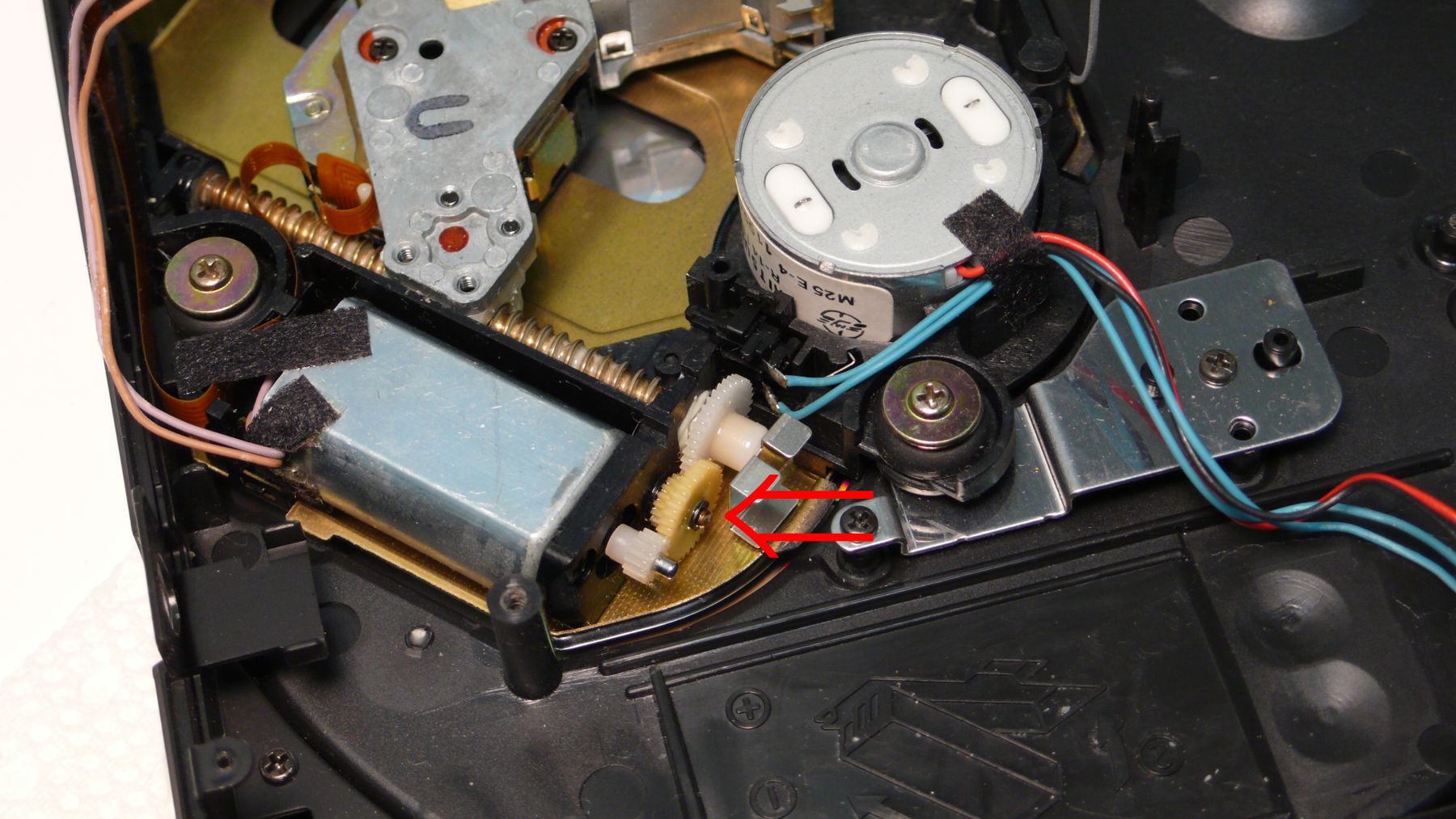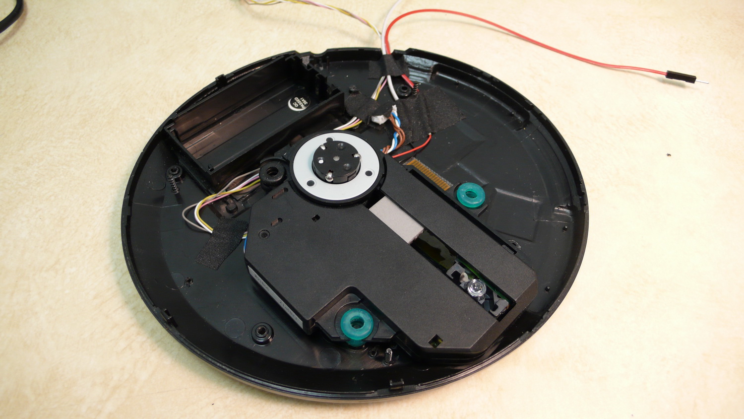 Three more grommets let the Discman wobble over the desk. Any vibration generated by spinning CD is detected by the gyroscope: