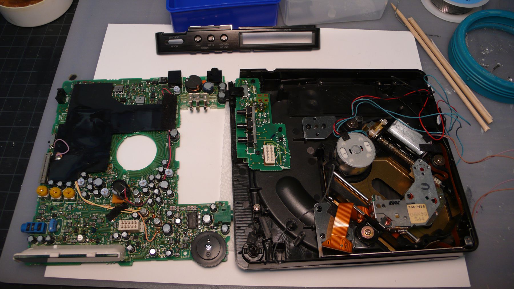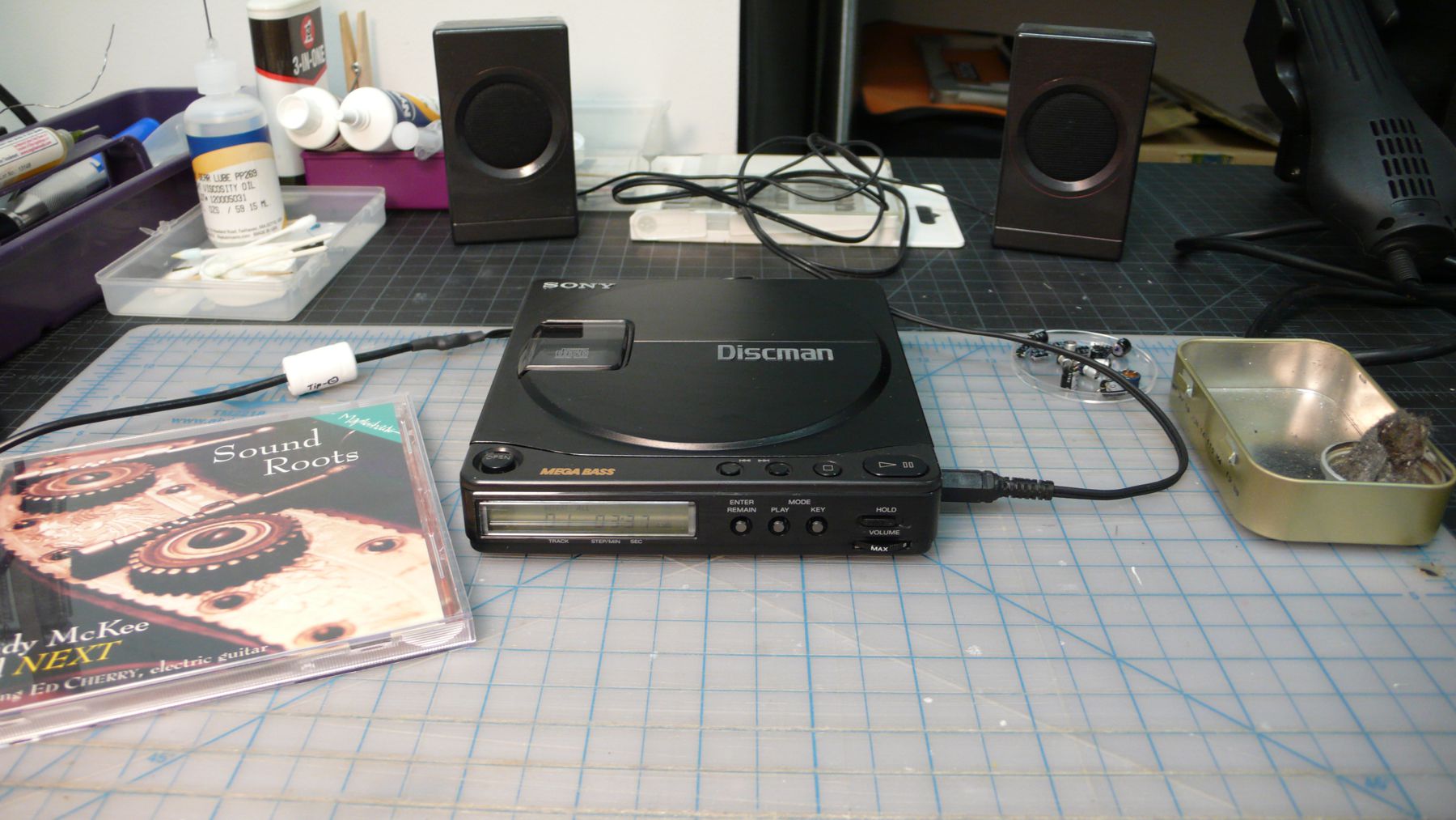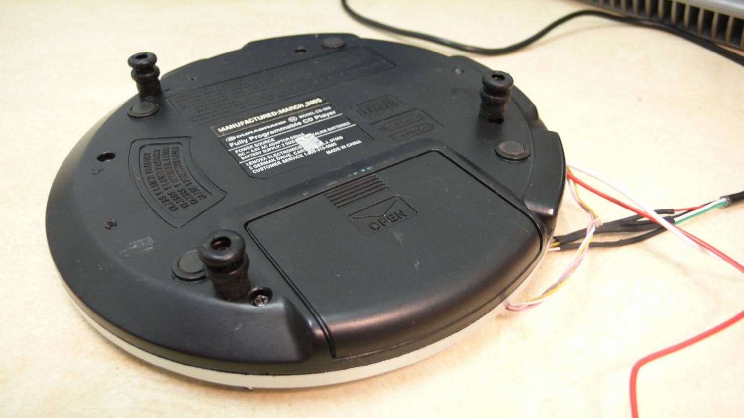 Three more grommets let the Discman wobble over the desk. Any vibration generated by spinning CD is detected by the gyroscope: