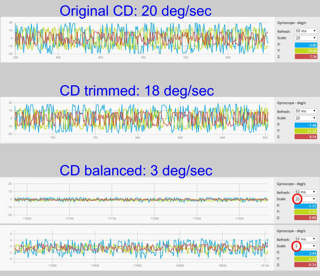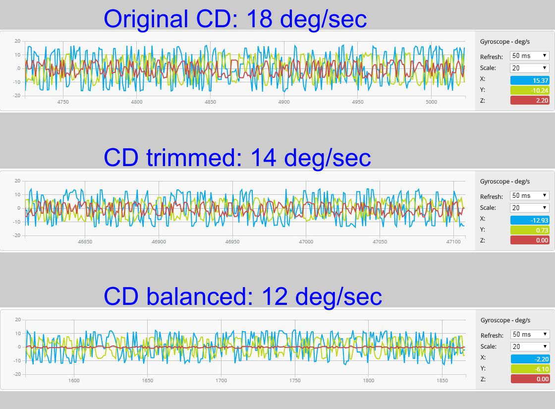 Here, once again, CD trimming did not reduce vibration, only CD balancing did! Please notice the dramatic decrease in Z-axis (vertical) vibration: