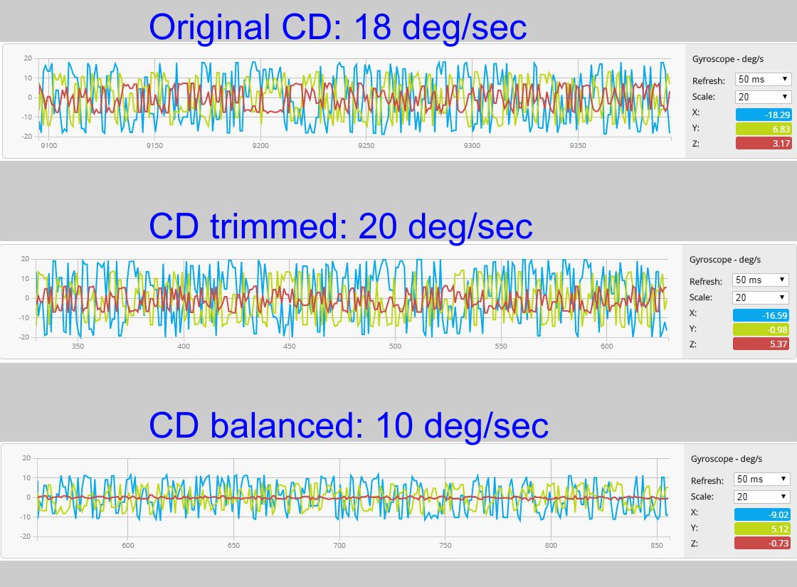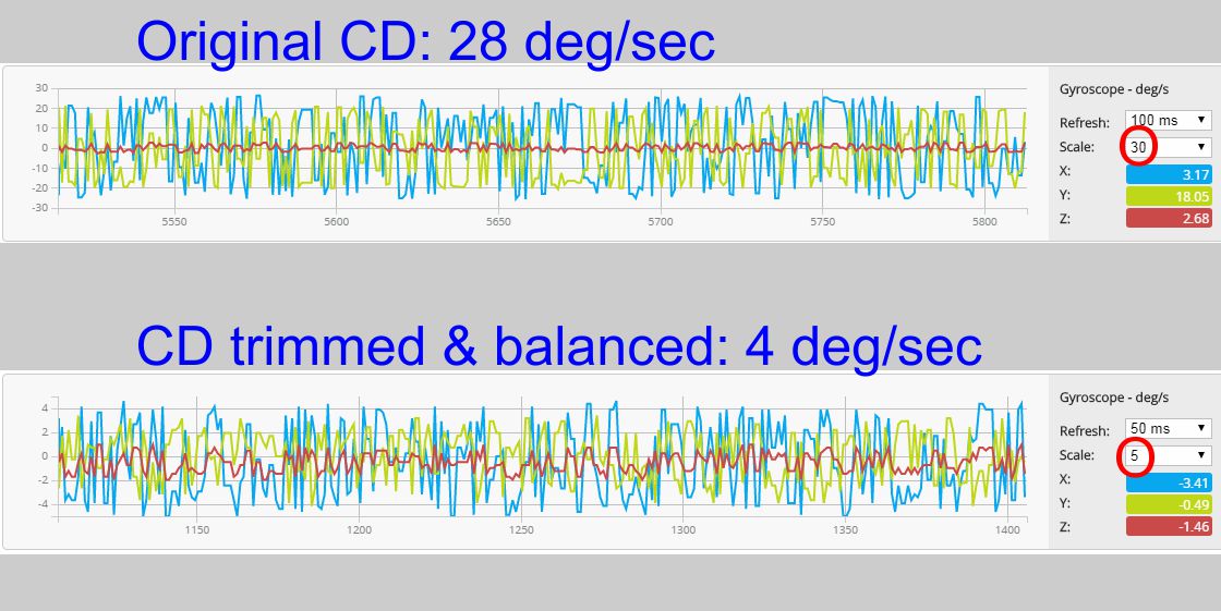 For the next CD original vibration reached 28 deg/sec! Edge trimming did not reduce vibration indicating that CD was perfectly circular and that there was some other reason why CD was badly unbalanced. Once Balanced, vibration dropped to 4 deg/sec: